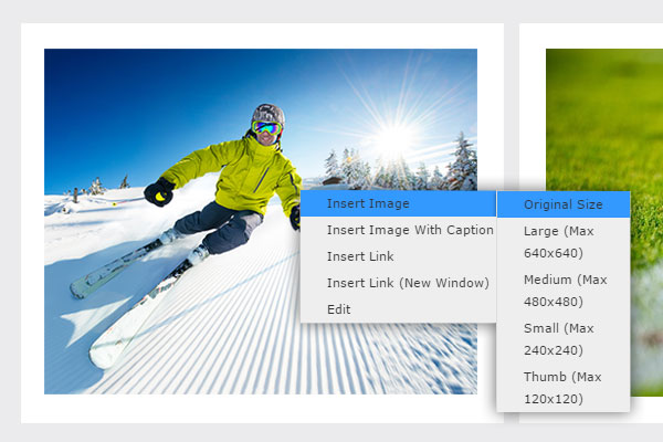 Images can be added to articles in many predefined sizes and the system automatically resizes the files to a smaller format for faster download in the website