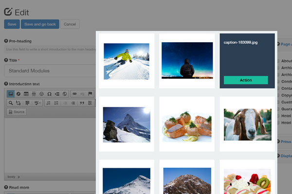 Images can be added to a files archive where they are made available for articles throughout the site.